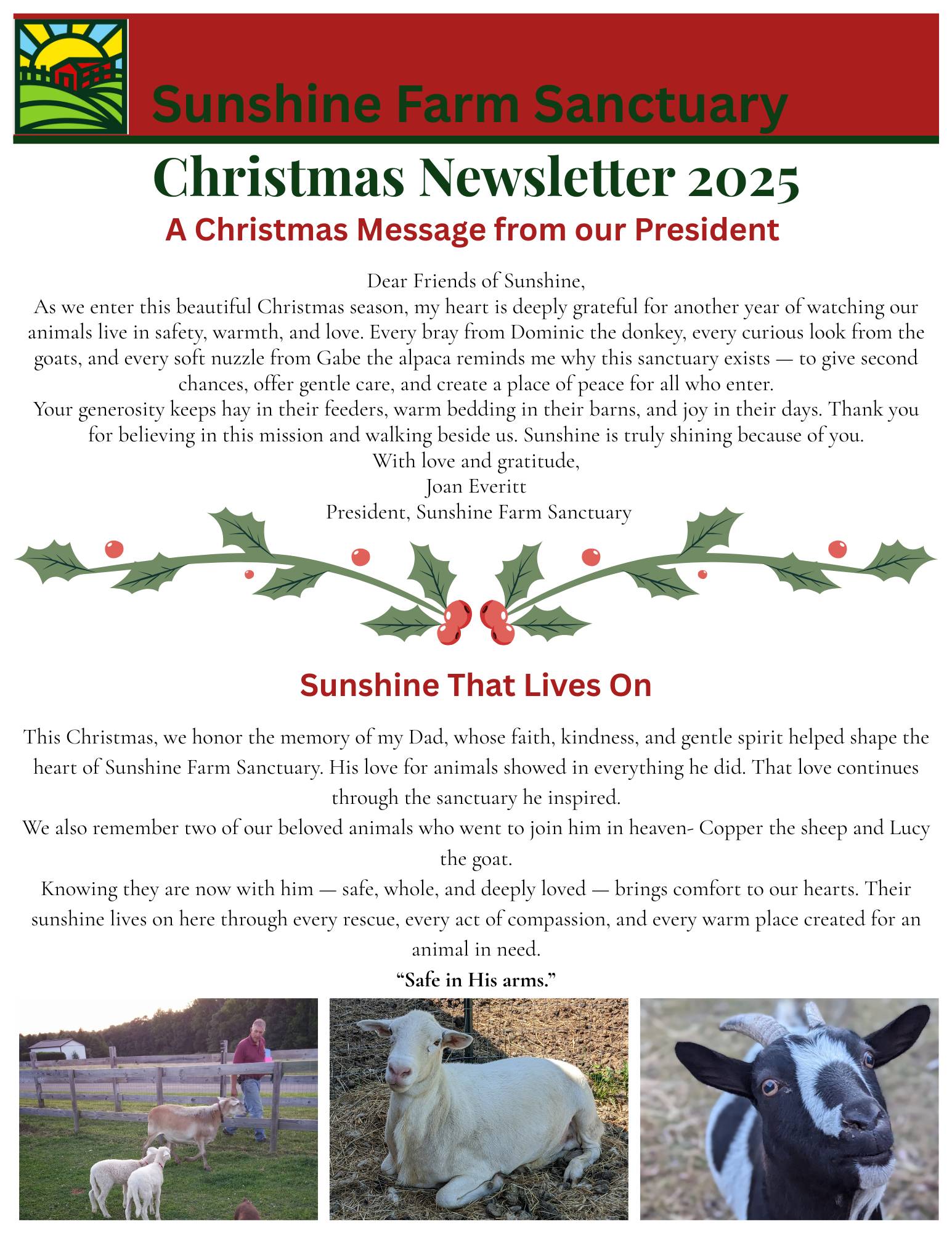 Click on the page to view this in Canva - Easier to read! Click on the page to view this in Canva - Easier to read! Click on the page to go to our donation page Click on the page to go to our donation page Donate Follow me on Instagram Sunshine Farm Sanctuary Inc | Montrose PA www.sunshinefarmsanctuary.org 600 1st Ave, Ste 330 PMB 92768, Seattle, WA 98104-2246Unsubscribe · Preferences